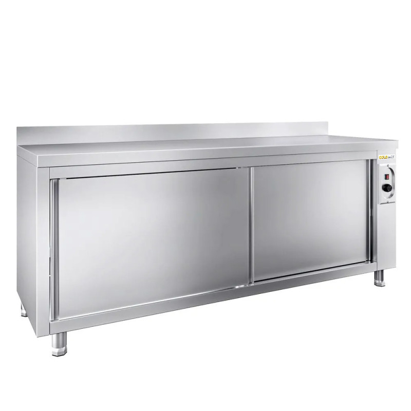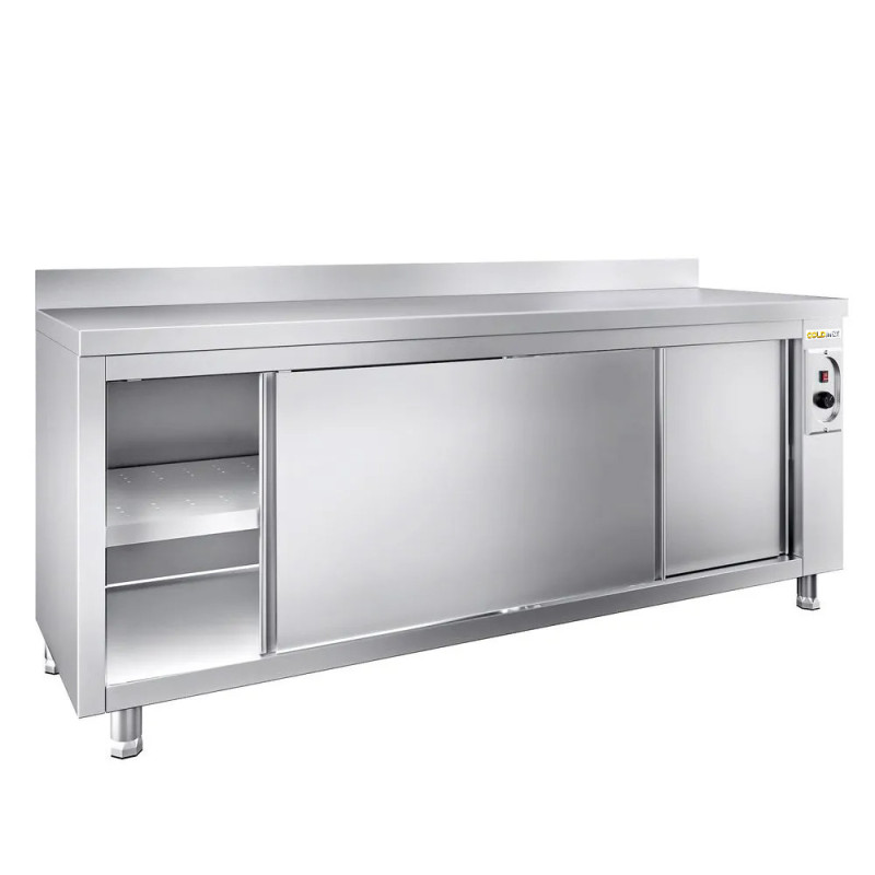 La cavité de chauffe assure une distribution régulière de la chaleur pour préserver la qualité et la température des préparations. L’étagère intermédiaire réglable facilite l’organisation tandis que les portes coulissantes insonorisées à double paroi favorisent une utilisation silencieuse et durable. Le meuble est facile à nettoyer pour répondre aux exigences d’hygiène des cuisines pro.