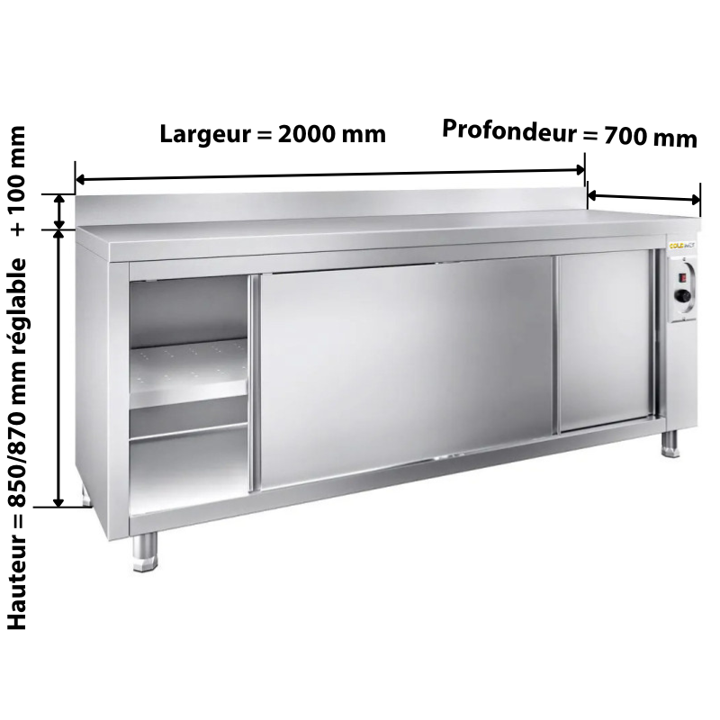 Meuble bas inox chauffant 2000x700 mm adossé PREMIUM - GOLDINOX