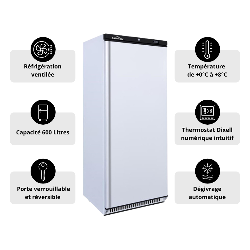 L'armoire réfrigérée blanche PREMIUM GOLDINOX 600 Litres représente la solution idéale pour les professionnels du secteur CHR (Cafés, Hôtels, Restaurants) exigeant fiabilité, performance et facilité d'utilisation.