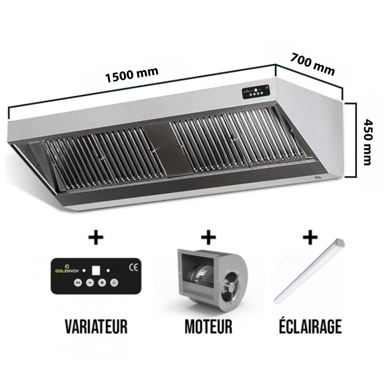 • Hotte professionnelle avec éclairage intégré, moteur et variateur fournis pour cuisine/restaurant