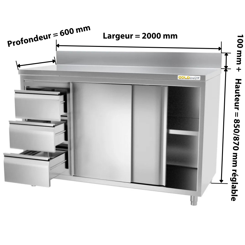 Meuble bas inox 2000x600 mm adossée avec 3 tiroirs à gauche PREMIUM - GOLDINOX