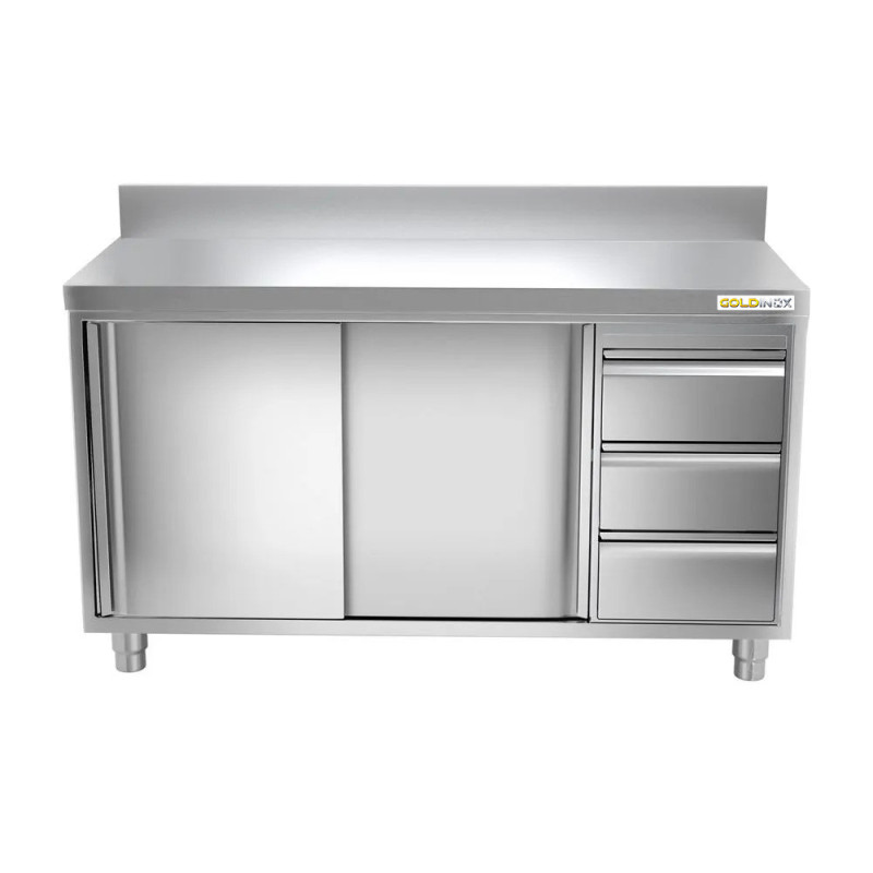 Meuble bas inox 2000x600 mm adossée avec 3 tiroirs à droite IDEAL - GOLDINOX