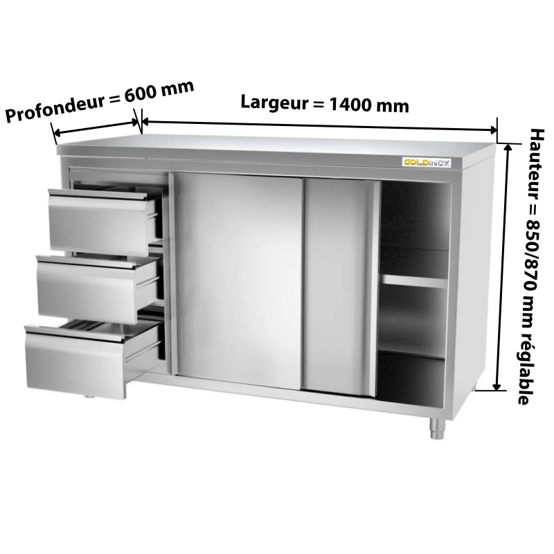 Meuble bas inox 1400x600 mm avec 3 tiroirs à gauche IDEAL - GOLDINOX