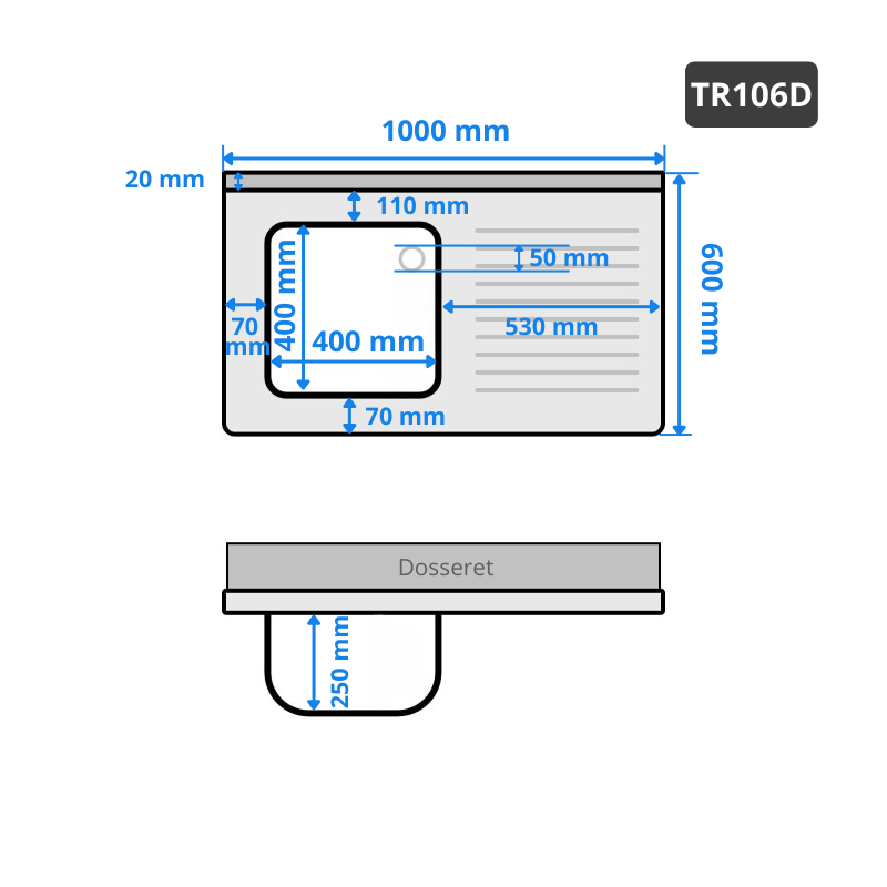 Le bac insonorisé améliore significativement le confort de travail en réduisant les nuisances sonores lors du lavage, un atout particulièrement apprécié dans les environnements bruyants. Le dosseret de 100 mm protège efficacement vos murs contre les projections d’eau et de débris, tandis que le débord arrière de 90 mm garantit un positionnement optimal contre le mur, éliminant les espaces inutiles et facilitant le nettoyage autour de la plonge.