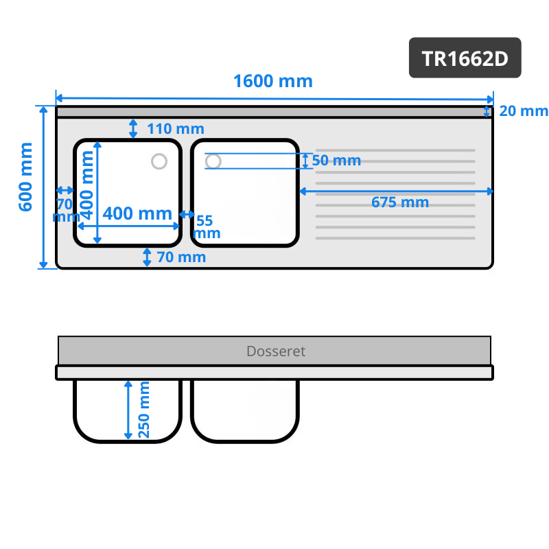 Plonge inox 2 bacs - 1600 x 600 mm égouttoir droite ECO / GOLDINOX