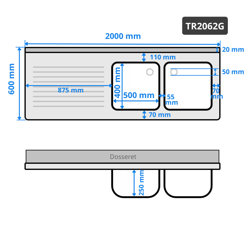 • Dimensions des cuves : 500 x 400 x 250 mm
