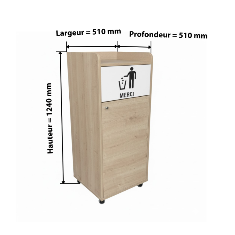 En bois, cette poubelle snack est dotée à l'intérieur de bacs pour maintenir le sac poubelle de 100 litres. Afin de faciliter le changement des sacs la poubelle dispose d'une ouverture inférieure ainsi que d'un rideau basculant en haut pour son utilisation.