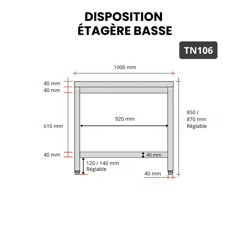 Pensée pour évoluer avec vos besoins, elle peut être équipée en option d’une étagère supplémentaire ou d’un kit roulettes pour une mobilité accrue. Conforme aux exigences des normes CE, cette table professionnelle en inox est un incontournable pour tous les métiers de bouche à la recherche de performance, de propreté et de fiabilité.